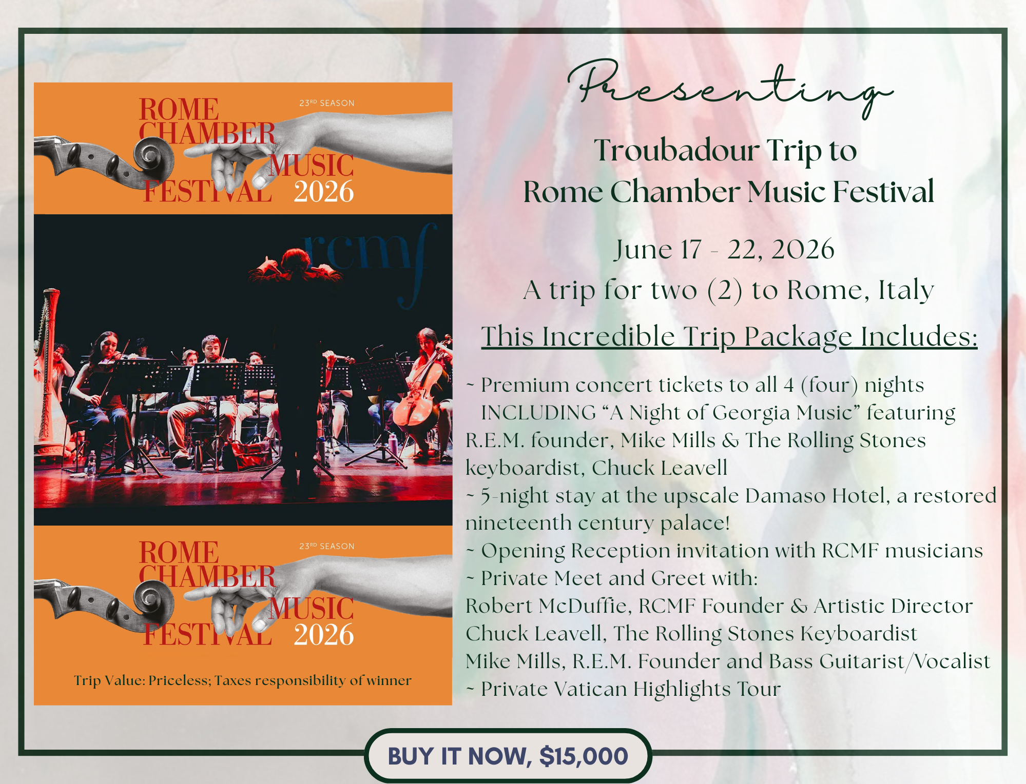 Tuesday, March 3 is the highly anticipated Prelude Luncheon featuring Mary Whyte. The silent auction at the luncheon will not disappoint with premium items being offered. Including our Troubadour Trips - two separate trips to Europe! First, a trip to the Loire Valley in France hosted by Yuriy Bekker, CSO Artistic Director. Second, a trip to Rome, Italy hosted by Woody Kerr, CSO Board President. Both trips offer a musical experience you won’t want to miss. You can make one part of your summer adventure right now!